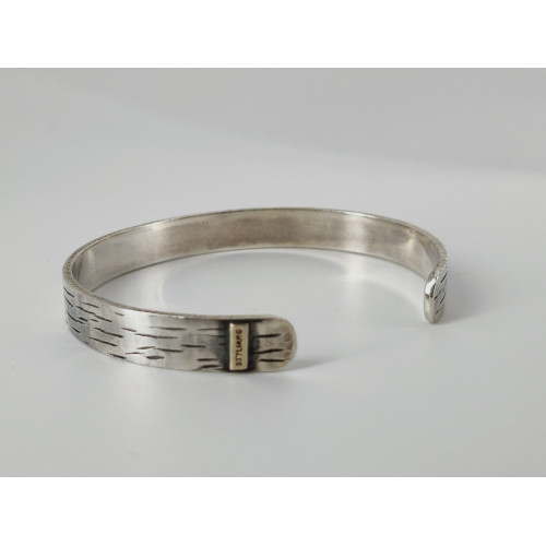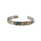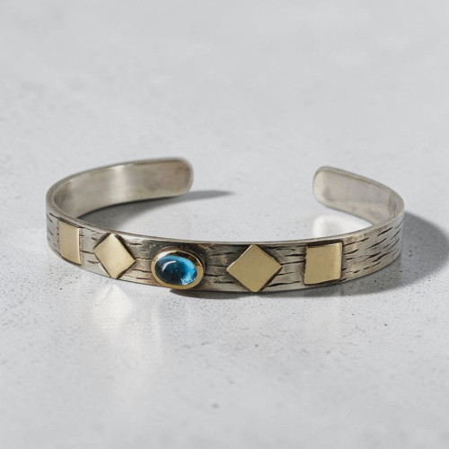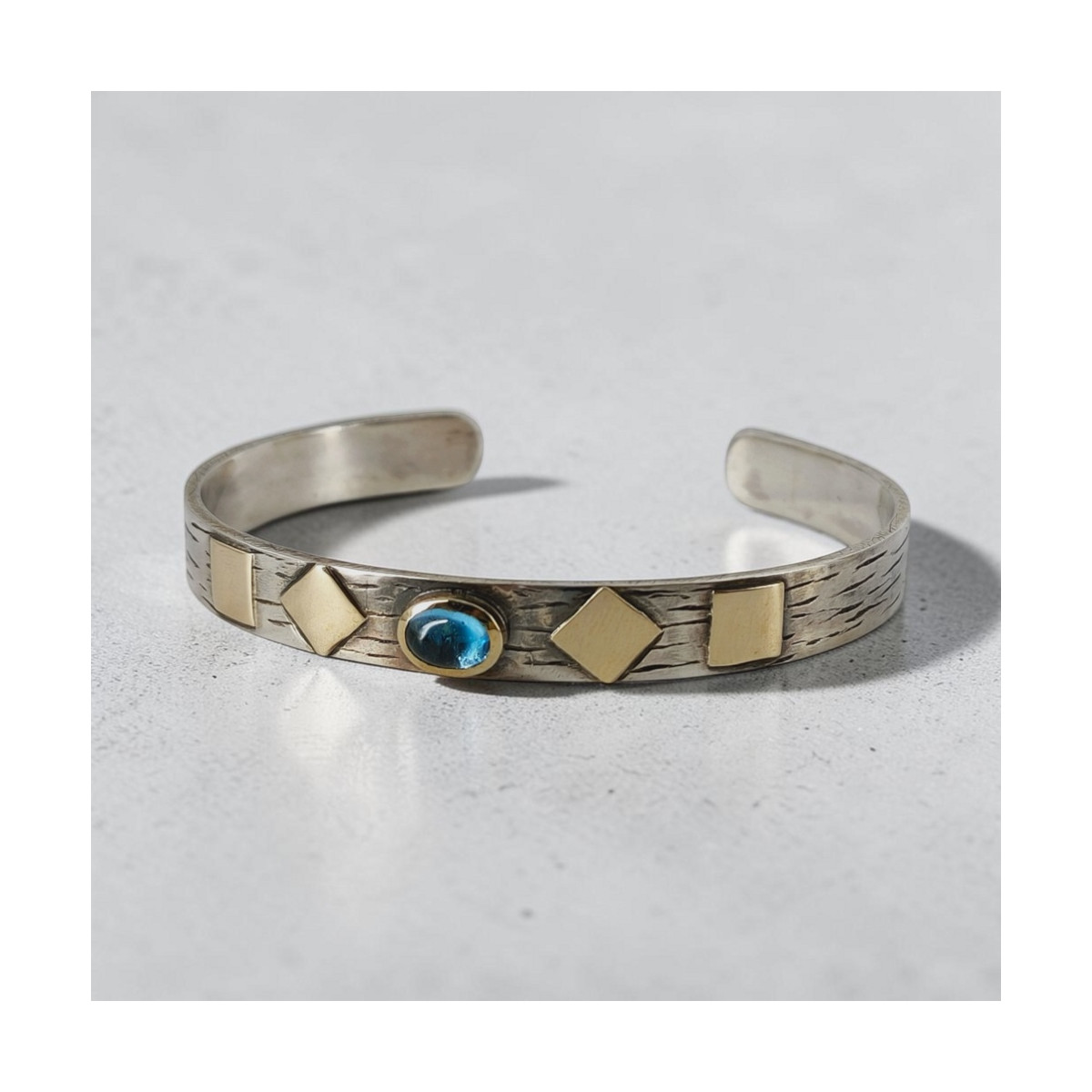 Precioso brazalete macizo de plata con decoración de dos rombos y dos cuadrados en oro. en la parte corona un topacio azul en talla cabujón oval