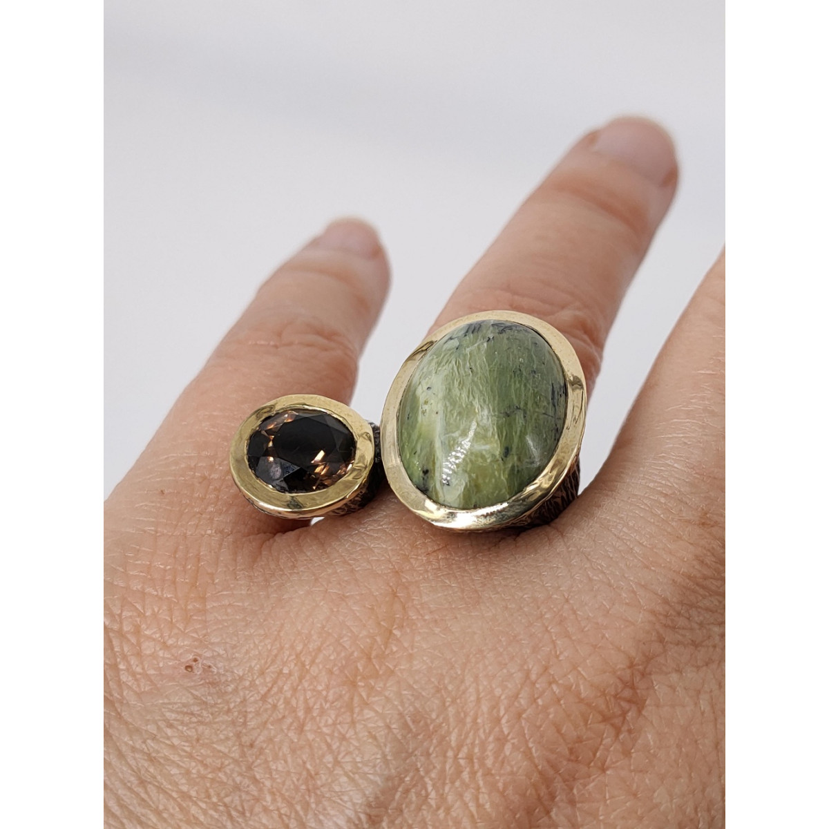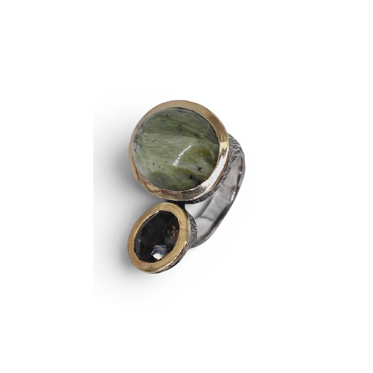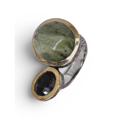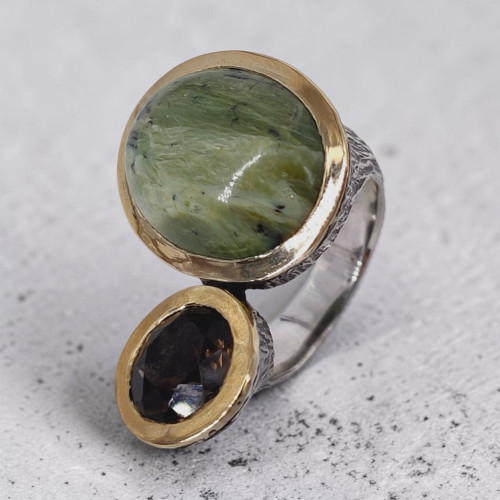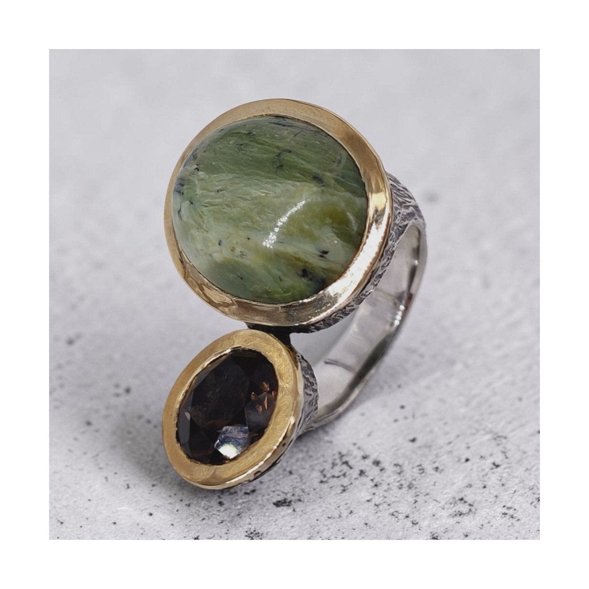 Anillo de plata y oro, ópalo verde, cuarzo fumé